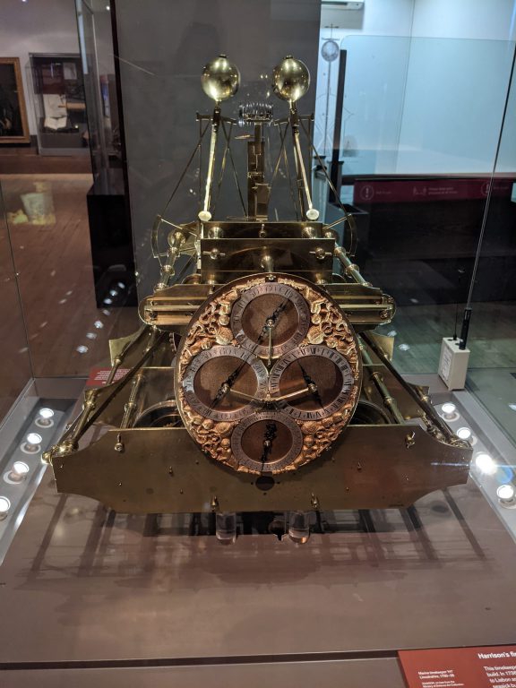 Harrison’s 4 famous clocks shine in their golden glory and decreasing size as their architect struggled to master the thorny issue of how to make a clock tick on a boat (not using gravity apparently).
