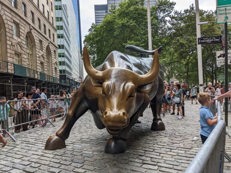 We met Wall Streetโs celebrity and surprisingly enormous golden bull, which draws a bit of a crowd (the queue for a bull selfie is not insubstantial), before wandering down high-sided streets straight out of Gotham city.